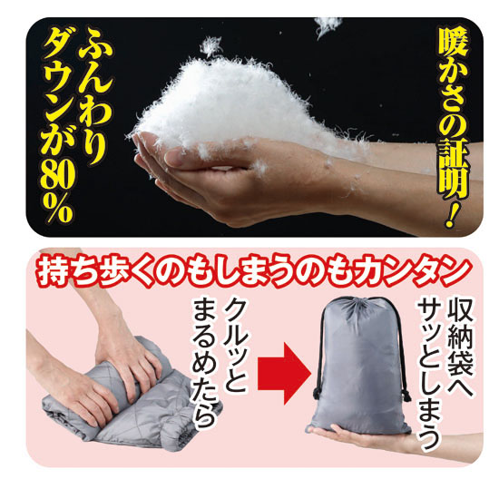 防寒ウエアとして№1の暖かさを誇るアイテムといえば、ダウンコートやジャケットといえるでしょう。その実力をパンツの中材に活かした、驚異の保温力を発揮するダウンパンツのご紹介です。暖かさに加え軽さも驚き! ダウン80%、フェザー20%とこれなら真冬の屋外でもぽかぽかぬくぬく間違いなしで、一日中はいてもOKです。そんなたっぷり入ったダウンのおかげで、室内にいれば暖房いらずの省エネアイテムとしても活躍。グレーとブラックの2色組で収納袋付きですから持ち歩きもらくらくです。はかない時はクルッと丸められて保管も簡単。寒さが厳しくなる前に、ぜひお求めください。