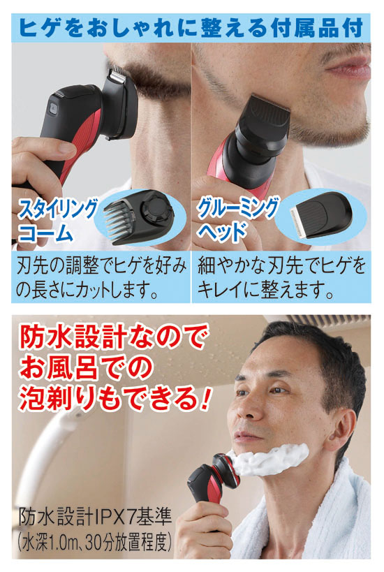 クセヒゲがなかなか剃れない…。毎日のヒゲ剃りをもっとラクにしたい…。そんな男性なら誰しも感じるヒゲのお悩みをスパッと解決する画期的なシェーバーのご紹介です。日本初のカットシステムが搭載された話題の商品で、究極の剃り心地を実現。回転する外刃がどんなヒゲでもスムーズに捉え、逆回転する内刃がスパッと素早くカット。さらに、肌のあらゆる凹凸に密着し、長いヒゲや短いヒゲも根元からきれいにカットします。もちろん剃り残しがなく、肌ざわりツルツル。防水設計なのでお風呂でのヒゲ剃りも可能で、シェービングフォームも使えます。剃りにくいクセヒゲやモミアゲは付属のアタッチメントを使えば至極簡単。置くだけの簡単充電式で、電池残量はひと目で分かり便利です。毎日使う喜びを感じさせてくれる、高級感のあるデザインもおすすめです。