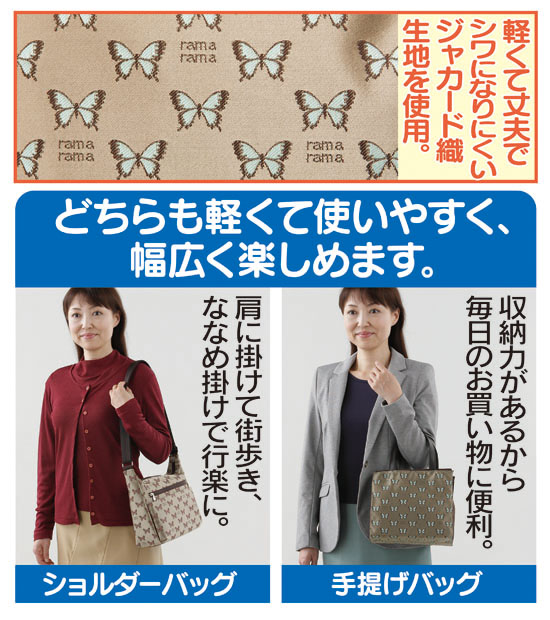 軽くて丈夫で、美しい紋様が魅力のジャカード織生地を使用! 可憐な蝶々の柄が、お出かけする貴女を若々しく見せてくれる、日本文化センターオリジナルのショルダーと手提げのバッグセットです。日本の職人が丹精込めて仕上げた逸品で、細かな部分までも完成度が高く、末長くご愛用いただけます。軽量ですので長時間のご使用でも疲れにくく、シワになりにくい素材で、荷物を詰め込んでも型くずれしにくいのが特徴。ショルダーバッグはななめ掛けができ、両手が空くので傘を差しての外出も安心です。ポケットも数多くあり、かさばる物から小物まで分類・整理して収納できます。手提げバッグはマチが約12cmと抜群の収納力を誇り、両側のファスナーポケットも大変重宝。お買物目的の街歩きなら手提げ、ご旅行などにはショルダーとシーンに合わせてお使い分けいただけます。