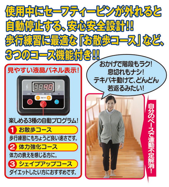 歩かないとますます歩けなくなる…でも、足腰が不安で、その一歩が踏み出せないというご高齢の方には特におすすめ! つかまり歩きもできる、手すり付き電動ウォーカーの登場です。さらに、使用中に転んだり足を踏み外した際にセーフティーピンが外れると、すぐに自動停止しますので、これならもう大丈夫。安心してお使いいただけます。歩行練習にちょうどよい①お散歩コース、体力回復をめざす②体力強化コース、理想の体型へ近づく③シェイプアップコースと、使用目的によって選べる3つのコース機能を搭載。①から初めて、自信がついたら②へ、さらに③へと、ステップアップしていく楽しみもあります。使わないときは折りたたんで収納できるので場所を取らず、キャスター付きで移動もらくらく。お天気も時間も気にせず、いつでも家の中で、気軽に安心して運動不足対策でお使いいただくことができる一台です。