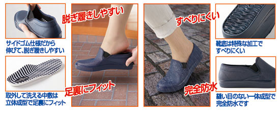 糸を使わない一体成型の完全防水シューズです! コレなら縫い目から水がしみ込む心配はなく、雨でも雪でも安心してお出かけになれます。さらに靴底は、地面をしっかりグリップする形状で、濡れた舗道や凍った路面でもスイスイ歩けます。履き口サイドはゴム仕様になっていて、脱ぎ履きらくらく。スッキリした見るからに軽快なデザインで、重さも片足約230gと軽量。履いて歩きまわるのが、楽しくなる一足です。衝撃を和らげるクッション性の高い中敷は、取り外して洗えるので、いつも清潔。しっかりした造りの日本製で、長くご愛用いただけます。どんな装いとも合わせやすいブラックとネイビーの2色から、お好きなほうをお選びください。