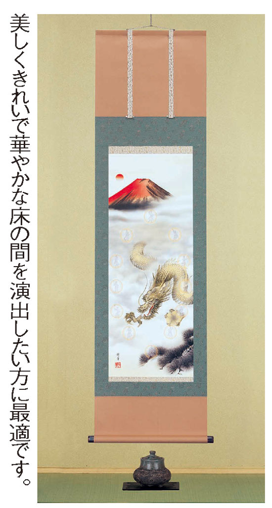 古来より威厳あふれる様で忍び寄る厄災をことごとく追い払う「龍神」、運良く見ることができた者には限りない吉兆をもたらすとされる金財運の象徴「赤富士」、家内安全・家運隆盛をもたらしてくれると言い伝えられている「十二神将」の3つの縁起物を中心に、すべての生命に恵みの光と温もりを授けるとされる「旭日」、雨を降らせ豊穣をもたらすとされる「雲」、松竹梅の最高位に君臨し長寿の象徴とされる「松」など、由緒正しい開運絵図が力強く描かれた掛け軸です。絵図を眺めているだけで心が清められ、心身に力が漲るのを感じ、さらなる幸運を呼び寄せてくれそうです。ご自宅にお飾りいただくことで、より一層の厄難除災をし、ご尊家の限りない厄除けと繁栄をもたらしてくれることでしょう。