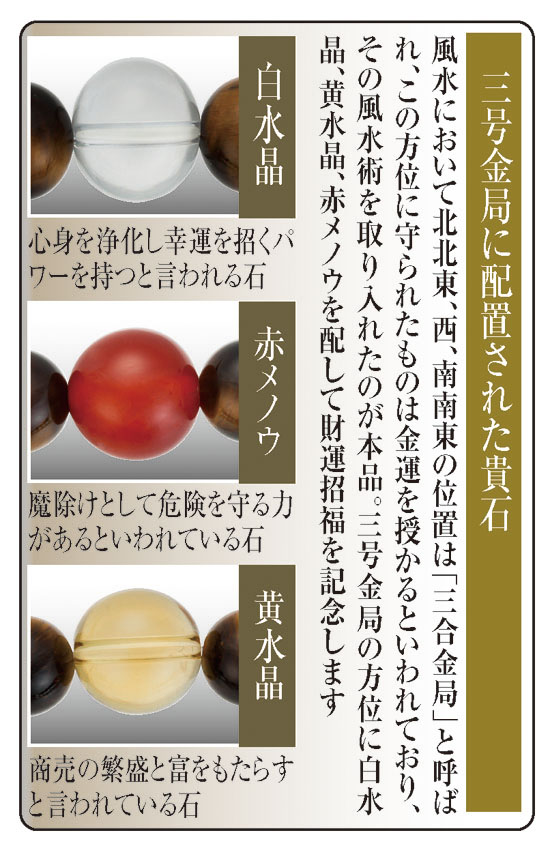 金脈の流れを最高位に高める風水最強の財運方位で、巨大な財力を招く秘術とされる「三合金局」を意味する配列をあしらった神秘のパワーを秘めたブレスレットです。「三合金局」は堅実な金運アップを招くとされ、十二支は「丑(北北東)・巳(南南東)・酉(西)」の三つの干支で構成されます。財運石のタイガーアイをたっぷり贅沢に連ねた中に配した、方角を意味する白水晶、黄水晶、赤メノウの3つのパワーストーンがお互いに影響し合います。中央には精度に優れ高い信頼性をもつ国産ムーブメントを採用した可愛らしい時計を取り付け、お洒落で毎日の暮らしに役立つ縁起の良いブレスレットの逸品に仕上げてあります。毎日、肌身離さず身につけて、金運上昇のチャンスをガッチリと掴んでください。