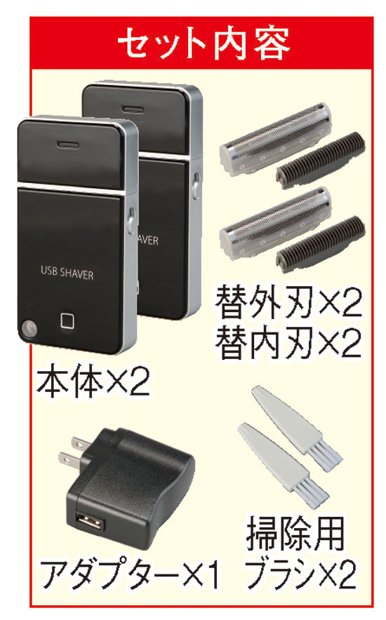 電動シェーバーをもっと気軽に携帯したい…。旅行にも持ち歩きやすいシェーバーが欲しい…。そんなご要望をカタチにしたのがこの軽量シェーバーです。見て驚くのはスマートフォンのような薄型でシンプルなそのデザイン。だから、手元においてもポケットやバッグに入れてもかさばらず、思い立ったらすぐに使えて便利です。もちろん、シェーバーとしての機能性も十分で、超薄外刃が毎分1万回往復振動するので剃り味抜群です。しかも、軽量で持ち歩きがラクで旅行などにも大活躍。ACアダプターも付いているので、ご自宅や宿泊先のコンセントからも充電できます。1度の充電で8時間も使えるので、何度も充電する手間が不要。今回は2個組なので、ご家族で使い分けたり、ご自宅用と持ち運び用に使い分けができたりと大変便利。お掃除ブラシ付きで、いつでも清潔に使えるのも魅力です。