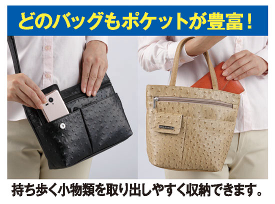 新しいお気に入りのバッグを、お値打ち価格でご入手いただけるチャンスです。高級感のあるオーストリッチ調型押しバッグ「同色お揃い3タイプセットを九六〇〇円!」でご提供いたします。このセットがあれば気分やシーンに合わせての使い分けが自由自在。ふだんのお出かけにはもちろん、ご旅行先でも颯爽とご愛用いただけます。ショルダーバッグとハンドバッグには7つ、ポシェットには4つのポケットが付いて、小物類の整理収納に大変便利です。色はブラック、ベージュ、パープルから、お好みのセットをお選びください。