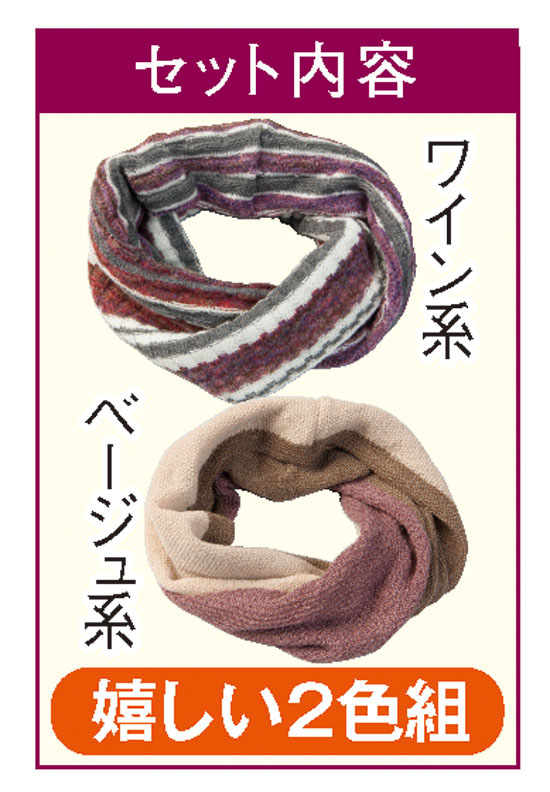 首回りの印象が寂しいと年齢よりも老けて見られがち…。そんな時、サッと頭からかぶるだけで首元を華やかに彩ってくれるスヌードのご紹介です。大人の女性にぴったりの味わい深いベージュ系とワイン系の2色組で、つけた瞬間いつもの着こなしの印象をパッと変えてくれます。素材は毛混なので肌ざわりがやさしく、ふんわりとしたボリューム感がありポカポカ暖か。マフラーみたいに巻き方を変える手間がなく、ペンダントのように素早くつけられるスマートさも魅力です。もちろん、ほどけたり巻き直したりする面倒がなくてラクラク。着こなしに合わせやすい2色組なので、気分や洋服に合わせて多彩なコーディネートが楽しめます。