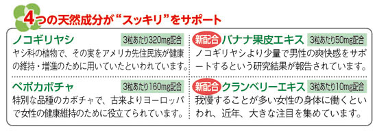若い頃のようなキレがない…。夜中に何度もトイレに起きてしまう…。そんな中高年のお悩みを解消してくれる日本文化センター独自開発の健康食品が、さらにパワーアップしました。主な原料は、男性の間で健康の維持に良いといわれ愛飲されてきたノコギリヤシと、女性のスッキリ感をサポートしてきたペポカボチャの種子です。どちらも業界トップレベルの配合量で不安をしっかり解消します。さらに今回、新たな成分として配合したのが、バナナ果皮エキスとクランベリーエキス。こちらも、近年の研究でスッキリ感を助ける新たなパワーが報告されています。この4つの成分を凝縮した当社自慢の新商品をぜひお試しになり、遠出の旅行やレジャーなどもトイレを気にせず思う存分お楽しみください。