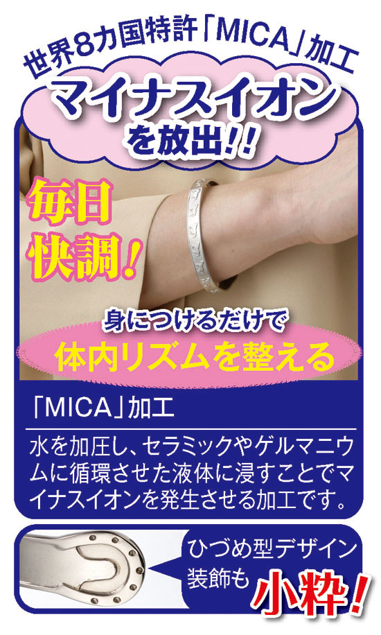 軽くて高硬度と耐蝕性に優れ、金属アレルギーになりにくく肌に優しい希少金属のチタニウムを使用した九頭馬ブレスです。干支でも人気の福駒9頭に、商売繁盛・出世・縁談・金運・勝負運・健康・夫婦仲・豊漁豊作・受験合格の9つの上昇運を願って刻みました。さらに、体内リズムを整えるマイナスイオンを発生する「MICA」加工を施し、身につけているだけで毎日元気に過ごせます。装着は弾力性がありらくらくで、どんな腕にもフィットするバンブル型のデザインと両端のひづめ装飾が手首を小粋に彩ります。紳士用、婦人用の2サイズからどちらか選べて、ご夫婦や男女兼用でも使えて便利です。