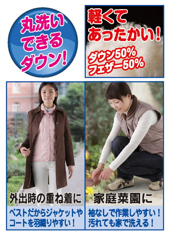 軽くて暖かなダウンをたっぷり使い、さらに裏地には、軽くて暖かく肌ざわりもよいフリースを使用した! 極めつけの「軽暖」贅沢ベストです。表地素材は風を通しにくく、北風ぴゅうぴゅうの真冬の外出もコレならふわぽか。お尻まですっぽり包むロング丈で、気になる体型も美しくカバーしてくれます。袖なしなのでお風呂掃除や家庭菜園などの作業もしやすく、汚れても家で手軽に洗えるダウンなので安心です。抜群の暖かさを持ちながらモコモコせず、上にコートやジャケットを羽織ってもお洒落に決まります。ピンクとブラウンの2色組で、ダウンベストでは破格の2枚で12,800円! お買物上手のミセスには見逃せないセットです。