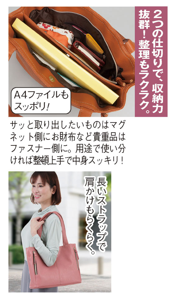 女性の外出はあれやこれや荷物が多くて大変です。背負うほどじゃないけど…。そんな時、このトートバッグ! 整理しながらたくさんの物が上手にしまえるバッグです。本革そっくりの合成皮革だからとってもタフ。設計がスゴくてA4サイズも入る内側は2つの収納スペースに分かれ、貴重品はちゃんとしまって落とさないファスナー式へ、何度も出し入れする物はマグネット式に仕分けて分納。外側には折りたたみ傘が入るファスナーポケットが2つあり、持ち手は長くて肩掛けもOKです。今回は、色違いの5個組というボリューム満点だから、ご家族やお仲間で分けるのもおすすめ。最後の一つは非常時の持ち出し用にもできます。とにかくお役に立ちますよ!
