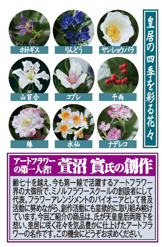 日本の象徴ともいうべき聖域、天皇皇后両陛下がおわします皇居には、一年を通じ四季折々の花々が美しく咲き誇ります。自然をこよなく愛される両陛下が皇居を散策しながら、四季の花を愛でておられるお姿もしのばれます。お届けするのは、そんな篤い思いを込めて創作されたアートフラワーの名品です。春を告げるコブシ、サンショウバラ。初夏に咲く山百合。秋を彩るリンドウ、ナデシコ。冬に咲くホトトギス、赤い実をつける千両。そして再び春の到来を告げる椿。皇居の四季を彩る9種の花々が、一年中わが家でお楽しみいただけます。清楚な陶製の花器には尊い菊の御紋が彫り込まれ、玄関や床の間に飾れば、風格あるインテリアにも。光触媒加工を施したアートフラワーは汚れにくく、抗菌消臭効果はもちろん、アレルギー対策にもなります。