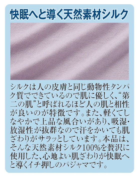 睡眠中、肌がカサカサしてかゆい…。パジャマの生地がチクチクして眠れない…。そんなお悩みをスッキリ解消するのがこのパジャマです。肌側にシルクが出るように編み上げた生地は、天然の保湿成分を含み吸湿性にも優れています。肌ざわりがなめらかで心地よく、着ているだけで肌が乾燥しにくく、かゆくなりにくいのが特徴です。しかも、シルクは放湿性にも優れ、暑い季節はムレを防いでくれるので一年中快適。なめらかな肌ざわりは一度着たら手放せません。縫製にもこだわり、肩の縫製は袋状に仕上げているので縫代が肌に当たらず、かゆみが気になることもありません。表地と裏地の中間層は空気を溜め込む2重構造で、寒さが気になる日はやさしい温もりでいっぱい。心身ともに安らげるゆったりとしたデザインは寝返りもラクで、朝までぐっすり眠れます。