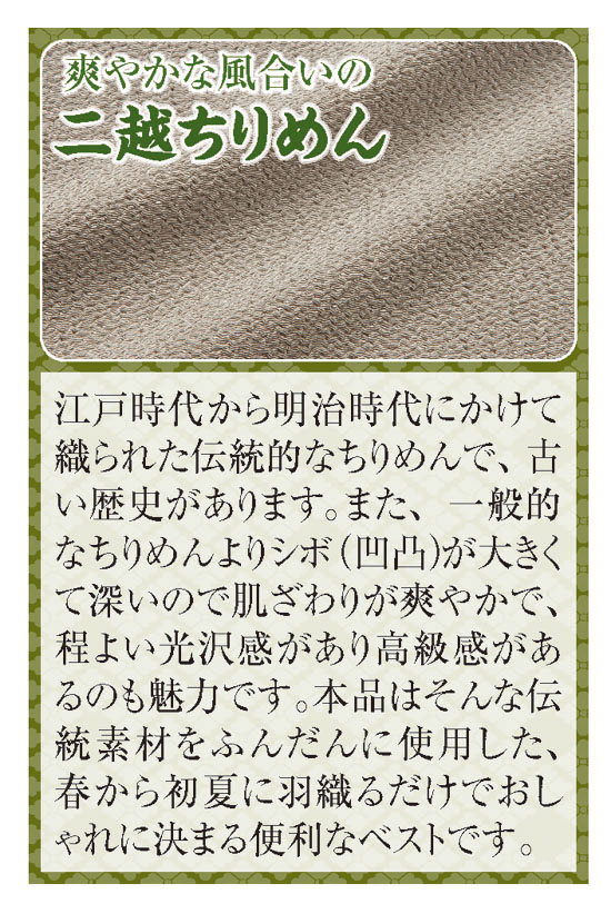 通常のちりめんと比べてシボが深い二越ちりめんを使用した軽く羽織れるベストです。肩と裾に着物のような和柄をあしらった和洋折衷のデザインが新鮮で、サッと羽織るだけでおしゃれな印象。着心地は程よいフィット感があり、左右の両裾はスリット入りで動きやすく、家事やお出かけにも最適です。お尻まですっぽり隠れるロング丈は、体型を上手にカバーします。二越ちりめんには凹凸があるので肌や衣服との接地面が少なく、着心地がサラッとして爽やかです。前ボタン仕様なので着脱がラクで、右脇ポケットは携帯電話などの収納にも便利。自宅で手洗いができ、2枚組なので洗い替えにも重宝します。カットソーやTシャツなどとも合わせやすく、夏まで多彩な装いが楽しめます。