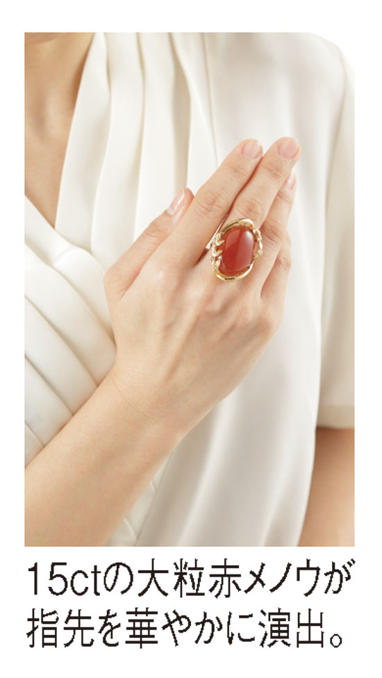 深紅の貴石、赤メノウのその大きさに思わず息を呑む、ゴージャスでボリューム満点のリングです。赤メノウは、なんと15ctと大粒で圧倒的な存在感があり、華やぎに満ちた指元を演出。さらに、周りにあしらった黄金色のつる草のデザインには3石のダイヤモンドが配され、リングの高級感をいっそう引き立てています。また、赤メノウは夫婦愛や健康、長寿の象徴といわれ、古くから多くの人に愛されてきた貴石の逸品。ここまで大粒でありながら15,000円を切るお値段も見逃せません。