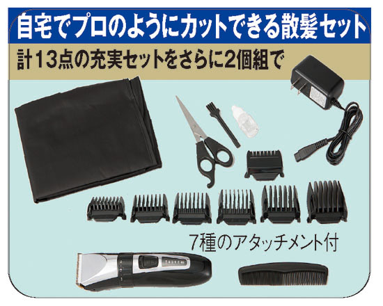 自宅で簡単にカットできるなら試したい…。節約できるならぜひ使いたい…。そんなご要望にお応えしたプロ仕様のバリカンです。おすすめのポイントは、自在にできる刈高調節。本体のダイヤルを回すだけで0.5mm単位の刈高が調節でき、簡単に髪の長さが揃えられます。アタッチメントは7種類と豊富で、刈高調節ダイヤルと組み合わせれば35段階の刈高調節が可能で、モミアゲなどのキワ剃りも驚くほど簡単です。軽くて持ちやすく、セラミックス製の上刃とステンレスにチタンコーティングを施した下刃は切れ味抜群。充電式でコードのわずらわしさがなく、初めてでも快適に使えます。急速60分充電で約45分使用でき、カットするには十分。充電池残量は本体に表示され、使用中に充電池が切れる心配もありません。お得な2個組で奉仕いたしますので、ぜひお見逃しなく!