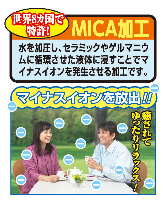 新開発技術のマイナスイオンを放出する「MICA触媒加工」を施した、お洒落なコンビブレスレットです。世界8ヵ国で特許を取得した画期的な技術で、マイナスイオンを放出! 森林浴のような効果が得られます。手首に着けるだけで、体内リズムが順調となり毎日元気で快調、すこやかに過ごせます。耐腐食性にすぐれたステンレス素材を丁重に磨き上げた輝きと、メッキのはがれにくいイオンプレイチングによるゴールド色とのコンビネーションで、ファッション性も抜群。サイズ調整も簡単で、男女兼用でお使いいただけます。2個セットなら、なんと5,000円も割安! ご夫婦ペアでお使いになれば、ともに末長く健康に暮らせ、ご夫婦の絆も深まります。