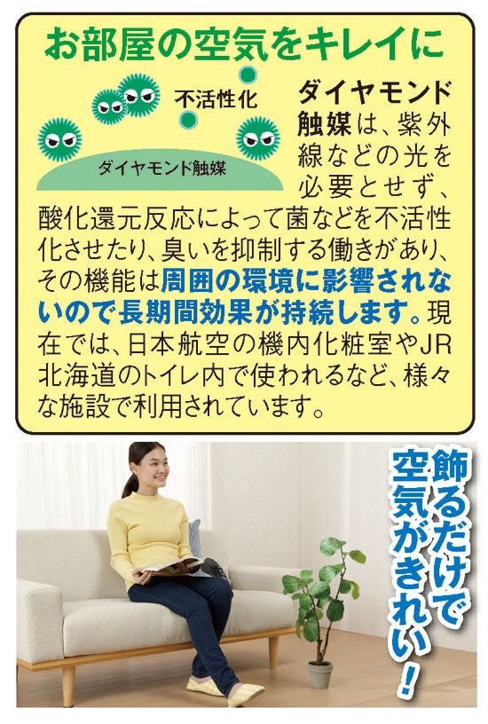 季節の変目になると部屋の空気が気になる…。部屋の不快なニオイをなんとかしたい…。という方に、お部屋に飾って置くだけで、抗菌、消臭などの触媒効果を発揮してくれる魔法のような造花のご紹介です。作ったのはヨーロッパを代表する有名造花メーカーで、日本の公的機関で実証されたダイヤモンド触媒を採用。ダイヤモンド触媒は、話題の光触媒のように光を必要としないので、薄暗い部屋などあらゆる場所で使えて便利です。しかも、半永久的に抗菌、消臭、防カビなどの触媒効果が続くので経済的。葉の葉脈や苔なども緻密に再現され本物のようで、お部屋にサッと置くだけで心和む空間を演出してくれます。水をあげたり、枯れることもなく、手間がかかないのも魅力。造花は3種類からお好きな1つがお選びいただけます。