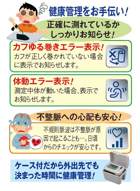 簡単な操作とコンパクトなサイズはそのままに、中高年の健康管理に欠かせない機能を凝縮して進化した、今話題の手首式血圧計です。新たな機能として搭載されたのは、手首にしっかり巻かれていない時に知らせる「カフゆる巻きエラー表示」。力が弱くてうまく巻けないご年配の方も、巻き直して正確に計れるから安心です。しかも、計測中に体が動くと知らせる機能も加わり、今まで以上に血圧測定は正確。さらに、脈波が乱れた状態の不規則脈波も検知。不規則脈波は、重い病気のサインといわれる不整脈の場合もあり、中高年の健康管理には特に重宝します。カレンダーや日時表示機能も搭載し、過去の血圧などを調べる際にも便利。2人分の測定結果が約2ヵ月分も保存でき、ご夫婦の健康管理にも活躍します。簡単操作でどなたでもラクに使え、大きな液晶画面で見やすいのもおすすめ。10年間の長期保証が、ご家族の健康を末永く見守ります。
