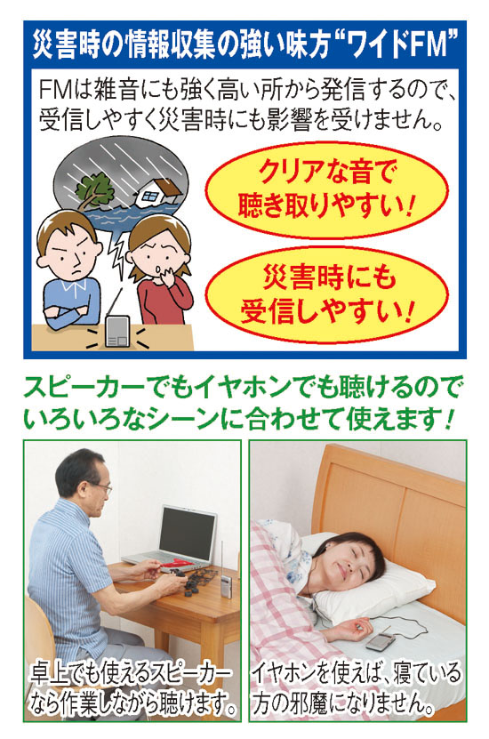 自宅はAM放送が入りにくい…。AM放送の雑音が気になる…。そんなお悩みをスッキリ解消する今話題のポケットラジオのご紹介です。人気の秘密は、手のひらに乗る小さなサイズでありながら、最新機能の "ワイドFM" に対応している点。AM放送が、FM放送のクリアできれいな音で聴けるので、歌番組やスポーツ中継も心行くまでお楽しみいただけます。しかも、どんな場所でも受信しやすいので災害時にも大活躍。今や一家1個は必需品のラジオです。ラジオの裏はベルトに装着簡単なクリップ付きで、散歩やウォーキングなどにも便利。スピーカーはもちろん、付属の両耳イヤホンも使えるので、深夜放送なども周りに気兼ねせず聴けて便利です。3個組なので外出用や寝室用、非常時用など使い分けにもおすすめ。なんと3個で8,900円というお得な価格も見逃せませんので、ぜひお買い求めください。