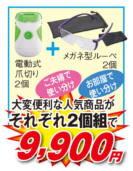 近頃、手元が見えにくく、爪を切るのも一苦労…。そんなお悩みをスッキリ解消してくれる便利な爪切りセットです。爪切りはなんと電動式で、力の弱いご年配の方でもラクラク。刃の付いたローラーが回転し、伸びた爪をやさしく削り取るから、ご年配の方も安心して使えます。さらに、本体を裏返して削れば、バリをきれいに取り去り仕上げも完璧です。今回は、そんな優れモノの電動式爪切りに、今話題のメガネ型ルーペをセット。拡大率1.6倍なので爪が大きくハッキリ見え、両手が使えるので爪切りはさらに快適です。また、新聞の文字なども大きく見え、様々なシーンで役立つのも魅力。電動式爪切りとメガネ型ルーペはそれぞれ2個組なので、ご夫婦用やお部屋に応じて使い分けたり大変便利。人気商品でありながら1万円を切る破格のお値段も見逃せません!