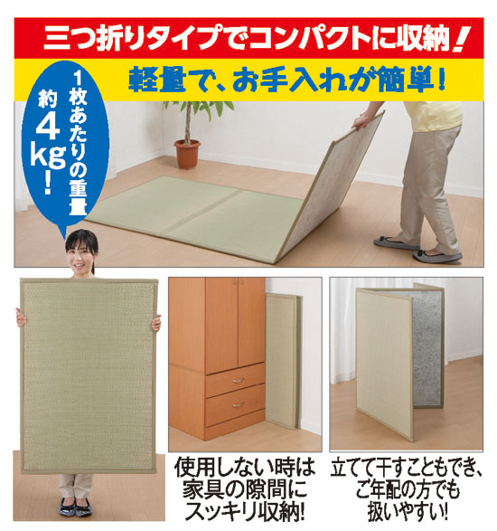 夏の敷物素材といえば、イ草がいちばん! 全国的に有名な九州産のイ草を使用した、三つ折りマットです。天然のエアコンと呼ばれるほどの調湿効果をはじめ、消臭性や抗菌効果もあり、お部屋を涼しく清潔に保ちます。敷布団の下に敷けばムレずに快適、板張りに直に敷いてもほどよいクッション性があり、格好のごろ寝マットになります。もちろんラグとしても使え、お部屋に敷くだけで夏らしい涼しげな雰囲気に早変わり、キズや汚れ隠しにもなります。裏面は不織布貼りで滑りにくく、フローリングなど洋間にもぴったり。三つ折りですので、収納場所も取りません。1枚売りのほかに、5,800円も割安になる2枚セットもご用意。2枚並べて敷けば、洋間に和室コーナーのでき上がり! ゆったりくつろげるだけでなく、洗濯物をたたむ場合などにも大変重宝します。