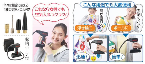アウトドアやレジャー、普段の暮らしに大活躍してくれる、車のシガーソケット専用の電動エアーコンプレッサーのご紹介です。大きなコンプレッサーの機能をコンパクトにした画期的な商品で、幅広いアイテムの空気入れに使える優れモノ。自転車のタイヤに空気を入れたい時や、アウトドアで浮き輪やボール、エアーマットなどをふくらませたい時など、幅広いシーンで使えて便利です。車のシガーソケットに接続するだけですぐ使え、わざわざ口から吹き込む面倒もなく、あっという間に空気が入るのでラクラク。軽量・コンパクトで持ちやすく、ワンタッチで使えるのでご年配の方でも安心です。さらに、LEDライト搭載で、夜、タイヤに空気を入れたい時にも便利。これ1台車に置いておくだけで、様々な場面で活躍しますので、ぜひおすすめいたします。