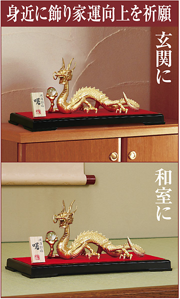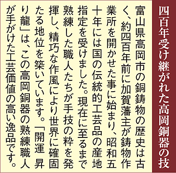 古来より強大な力を持つ守護神として崇められてきた龍。霊験あらたかな如意宝珠を手に持ち、天へと駆け上る昇り龍の雄姿は、運を切り開く神通力を表しています。さらに黄金龍は「富貴吉祥」の象徴とされ、金運、出世運、家庭運を呼び込む力があるとされてきました。「開運昇り龍」は、外から入ってくる邪気を払い、大いなる運気向上を祈願して飾るにふさわしい置物。富山県高岡市特産の伝統工芸品、高岡銅器の熟練職人が手がけた逸品です。亜鉛合金を使用していますので、ずっしりとした重厚感があり、メッキ仕上げのものにはない高級感が漂います。伝統工芸品の職人ならではの精緻な仕上げも魅力です。縁起のよい黄金の昇り龍を身近に置き、邪気退散と開運招来を祈願してください