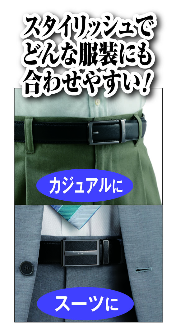ベルトの長さ調整を自分でするのが面倒、体型が変わるとベルトの穴が合わなくなる。長年使っているとベルトの穴が傷んでくる…。そんな悩みを解消するベルトです。従来のようにベルト穴がなく、32段階で調節できるトラッキングシステムを採用。穴式のベルトが4~5cm間隔なのに対し、なんと5ミリ単位で微調整ができます。ぴったりの締め具合で自動ロックされ、食事後などお腹が膨れてもバックルを浮かせて逆に戻すだけで調整でき心地よくフィット。傷みやすい穴がなく、付け外しの際に力がかからないため、ベルトは長持ちします。しかも世界的デザイナー山本寛斎氏がプロデュースするブランド製ですからスタイリッシュなデザインも魅力。デザイン違いの2本をセットにしてお届けしますので、服装にわせてお使いいただけます。
