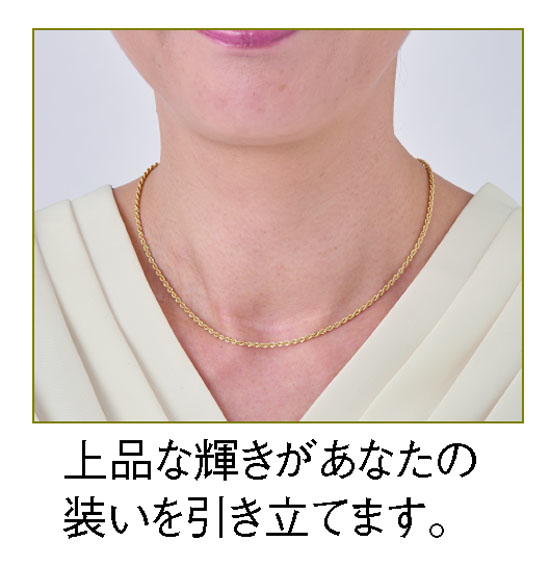 中を空洞化したパーツを流れるようにつなぎ合せた中空チェーン。こちらは日本ではまだ浸透していない、ヨーロッパの最新技術を用いて作り、最終工程を日本で行い仕上げました。ボリュームがあるのに、驚くほど軽いつけ心地、そして極めて繊細な輝きは、ヨーロッパの技術と日本の丁寧な仕事によるものに他なりません。シンプルで飽きのこないデザインですので、カジュアルからフォーマルまで幅広い装いにご利用いただけます。デコルテを流麗に流れる様、光を浴びたときの存在感はまさに18金ならでは。一生もののジュエリーとして、あなたの魅力を存分に引き出してくれることでしょう。昨今の金の高騰で資産価値も注目される18金。今が手に入れるチャンスです。