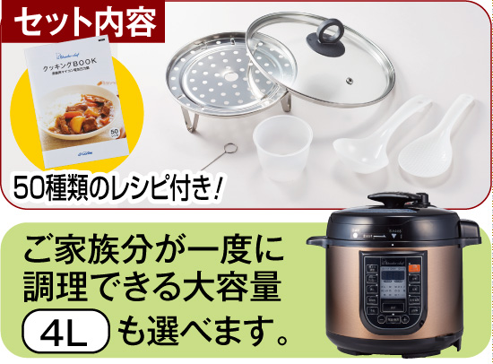 じっくり煮込んだ料理は時間がかかるし、圧力鍋は使いこなすのが大変。そんな悩みを解消する電気圧力鍋をご紹介。材料や調味料を入れて後はメニューボタンを押すだけ。手間と時間のかかる「肉じゃが」がなんとたった8分で美味しく作れます!「カレー」や「ブリ大根」もほんの15分と驚く程の短時間で調理でき、味が芯まで染みてコトコト煮込むのと同じような美味しさに仕上がります。また、素材の味を引き出し栄養も逃げない蒸し料理や無水調理も簡単!「アサリの酒蒸し」や「無水ミネストローネ」、さらに「炊飯」まで簡単に調理できます!火を使わないので目を離しても安心。今回はなんと50種のメニューが載ったレシピ付きでお届け。すぐにお好きな料理にチャレンジが可能です。容量は使い勝手の良い3L。ご家族分が一度で調理できる余裕の4Lもご用意しています。4Lタイプの商品ページをご覧ください。