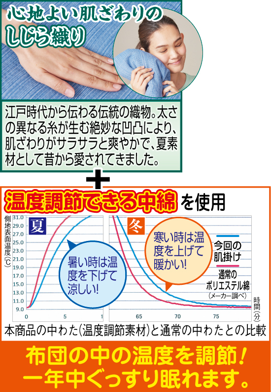 蒸し暑くて寝苦しい夜はクーラーを掛けたままで眠りたいけど、体が冷えすぎて困る。そんな方にピッタリの肌掛布団をご紹介します。表地には日本伝統のしじら織を使用していて、汗ばんでもサラッと爽快な肌ざわりで朝まで爽やかにぐっすりおやすみいただけます。さらに温度調節機能を持つ中わたを使用!暑い時は熱を吸収し、寒くなると熱を放出。まるでエアコンのような働きで睡眠中の温度をしっかりと管理するので、季節を問わず一年中大活躍します!汗や汚れが気になったら、ご家庭の洗濯機で丸洗いでき、お手入れも簡単です。日本文化センターでしか手に入らないこの肌掛け布団をセミダブル2枚で15,800円でお届け!2枚ならご夫婦でお使いになれ、洗い替えとしても重宝。ぜひこの機会にお申し込みください。シングル・ダブルもご用意しています。