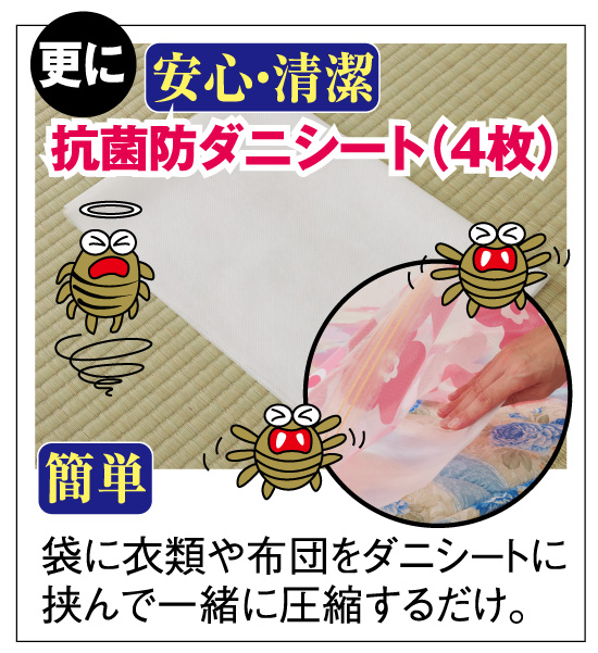 片づけが楽しくなる見た目に美しい花柄の圧縮袋のセットです。今や当たり前になった収納の省スペース術は圧縮すること。これはバルブに付属の電動の吸引ポンプをあててスイッチオンするだけの簡単操作で、一枚の厚みのある布団が見る間に圧縮されてスッキリ片付きます。同じように衣類専用の圧縮袋を加えたそれぞれ4枚ずつをセットに。さらに圧縮袋の中に入れて使える抗菌防臭防ダニシートが4枚、圧縮袋専用の電動吸引ポンプまでついた計1 0点組です。届いてすぐに使えて大変便利コロナ禍で在宅の機会が多く、整理や清掃が増える時には大活躍します。