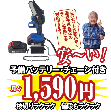 庭のお手入れをしたいけど太枝が切れなくて困った…。庭師に頼むとお金がかかるし…。そんなお悩みをお持ちの方には、パワフルで切れ味抜群の充電式ミニチェーンソーがおすすめです。電源コードをつなぐ必要がないから、庭中どこでも移動しながら使えます。ハンドル部分は細くて持ちやすい上、手元を照らすLEDライト、誤作動を防止するための安全ロックなど、小さなボディに安心の機能も充実。女性や初めての方でも安心して手軽にお使いいただけます。さらに、今回は特別に予備バッテーリー1台と予備チェーン1本をセットしてのご提供です。安心して末永く使える充電式ミニチェーンソーは、庭のお手入れのストレスを大き軽減してくれます。