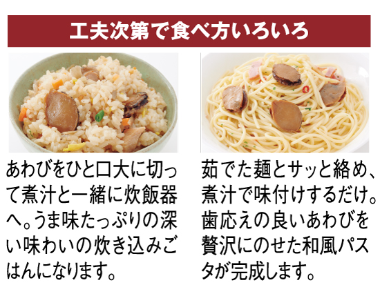 天然あわびの旨みを生かしたしょうゆベースの風味豊かな味付けと、歯切れ良い柔らかな食感が魅力のあわび煮貝。なかなか市場に出回らない業務用食材としてホテルや旅館、和食料理店に長く供給されてきた逸品を、今回は日本文化センターが特別にお値打ち価格で商品化しました。そのまま酒の肴やおかずとして、ちょっと手を加えればいろいろな料理にアレンジできます。ひと口大に切って煮汁と一緒に炊飯器に入れればうま味たっぷりの深い味わいの炊き込みごはんに。あるいは、茄でたパスタにサッとあわびを絡め、煮汁で味付けすれば歯応えの良いあわびを贅沢にのせた和風パスタが完成します。高級食材のあわびを12粒入4袋セットでお手元へ。甲州で愛されてきた味をぜひこの機会にお試しください。
