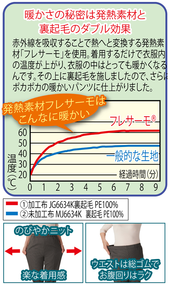 寒い冬、発熱作用と裏起毛でダブルのあたたかさを実感できるポカポカ発熱パンツをご紹介します。生地に赤外線を吸収して熱に変換する発熱素材フレサーモを使用し、さらに裏起毛を施しているのでパンツの中はとってもあたたか。しかもこのパンツはウエスト総ゴムで着脱しやすく、伸びのよいニット地で楽な履き心地を体感できます。デザインはシックな千鳥柄とセンタープレスで脚長効果も抜群、1枚で様になるパンツです。また両脇にはポケット付き。毎日はいていただきたいので人気の2色を2枚ずつの4枚セットとしました。また裾直しをしなくても直ぐに履いていただけるよう2丈からお選びいただけます。