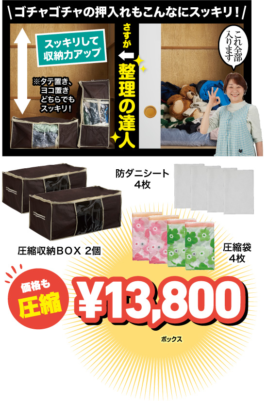 中身のみえる窓口付の収納ケースに圧縮袋が内蔵された大容量の圧縮ボックスと大好評のふとん圧縮袋のセットです。収納ボックスは底、側に型紙が内蔵されていて収納物に関係なく形を保ち、タテ、ヨコ設置可能。1つのボックスに大型クリアケース3個分が余裕で入ります。座ぶとんからダウンジャケット、果てはぬいぐるみまでまとめて圧縮できて押入れやクローゼットがたちまちスッキリ!セットの花柄圧縮袋は使ってない敷きふとんに掛けふとんをすっきり圧縮収納。抗菌ダニシートも付いて完ぺき。さあ、どっさり溜まった押入れの中身、クローゼットの衣類がアッという間に!クリアケース6ケ分の省スペースでだんぜんお得価格!